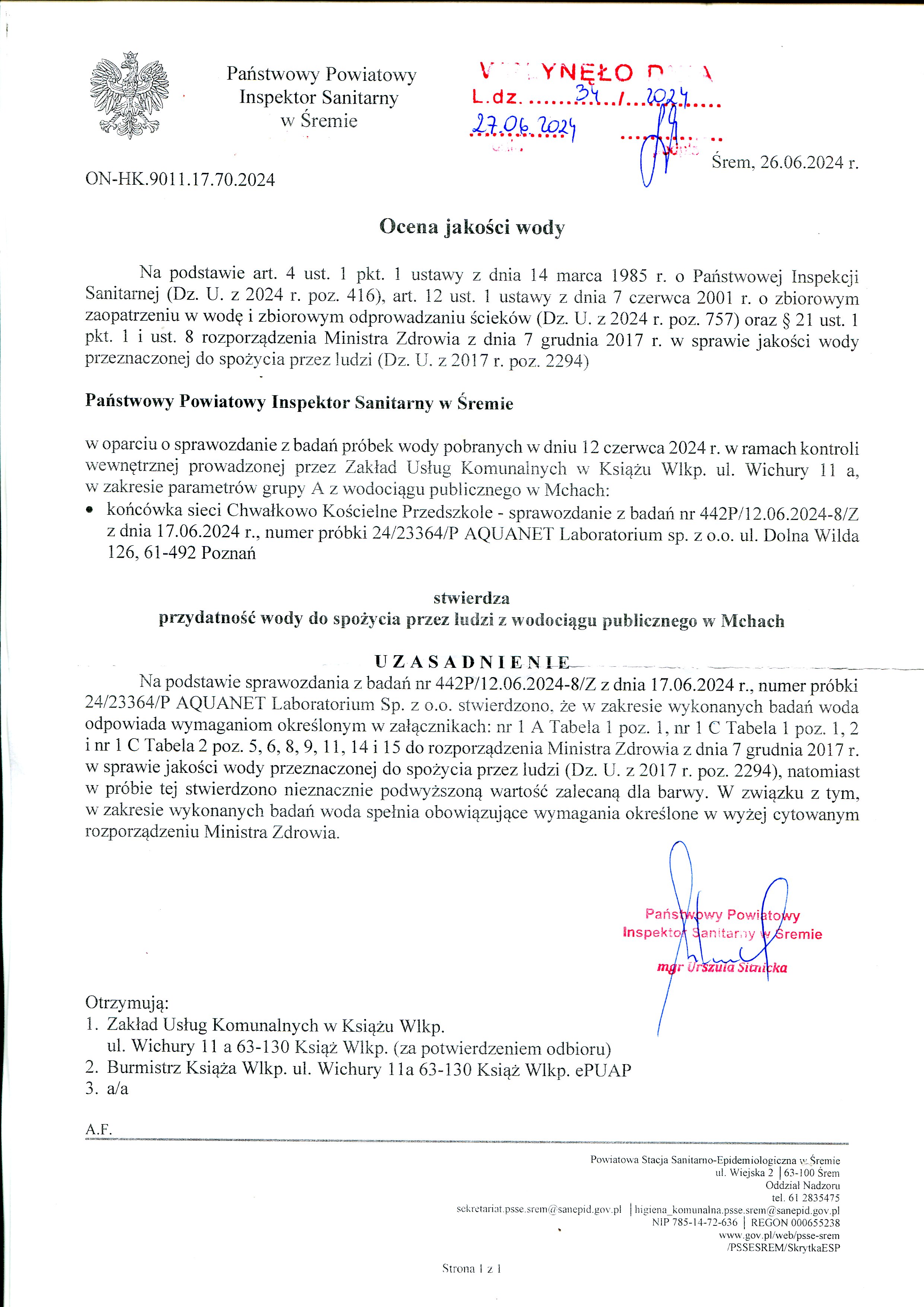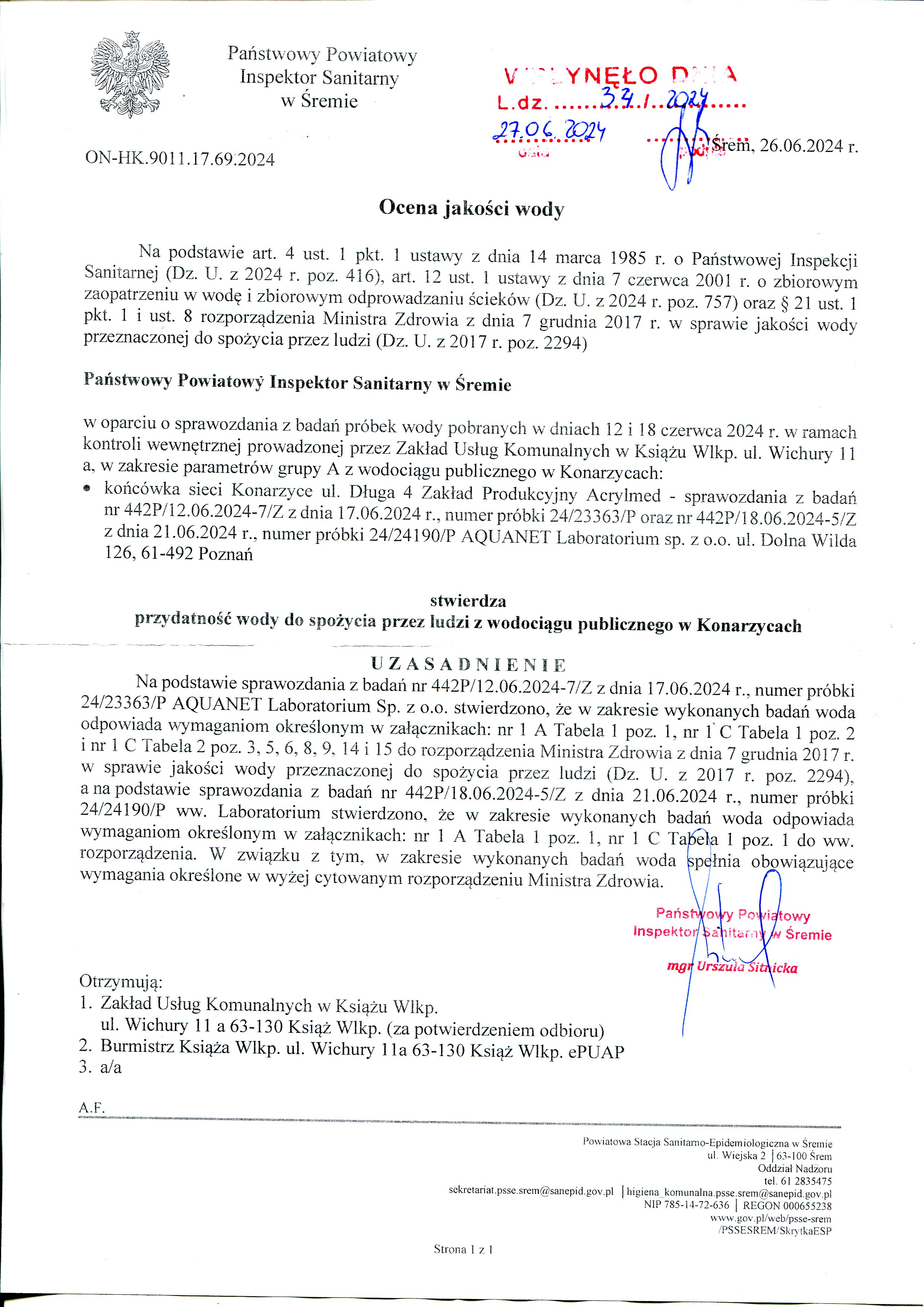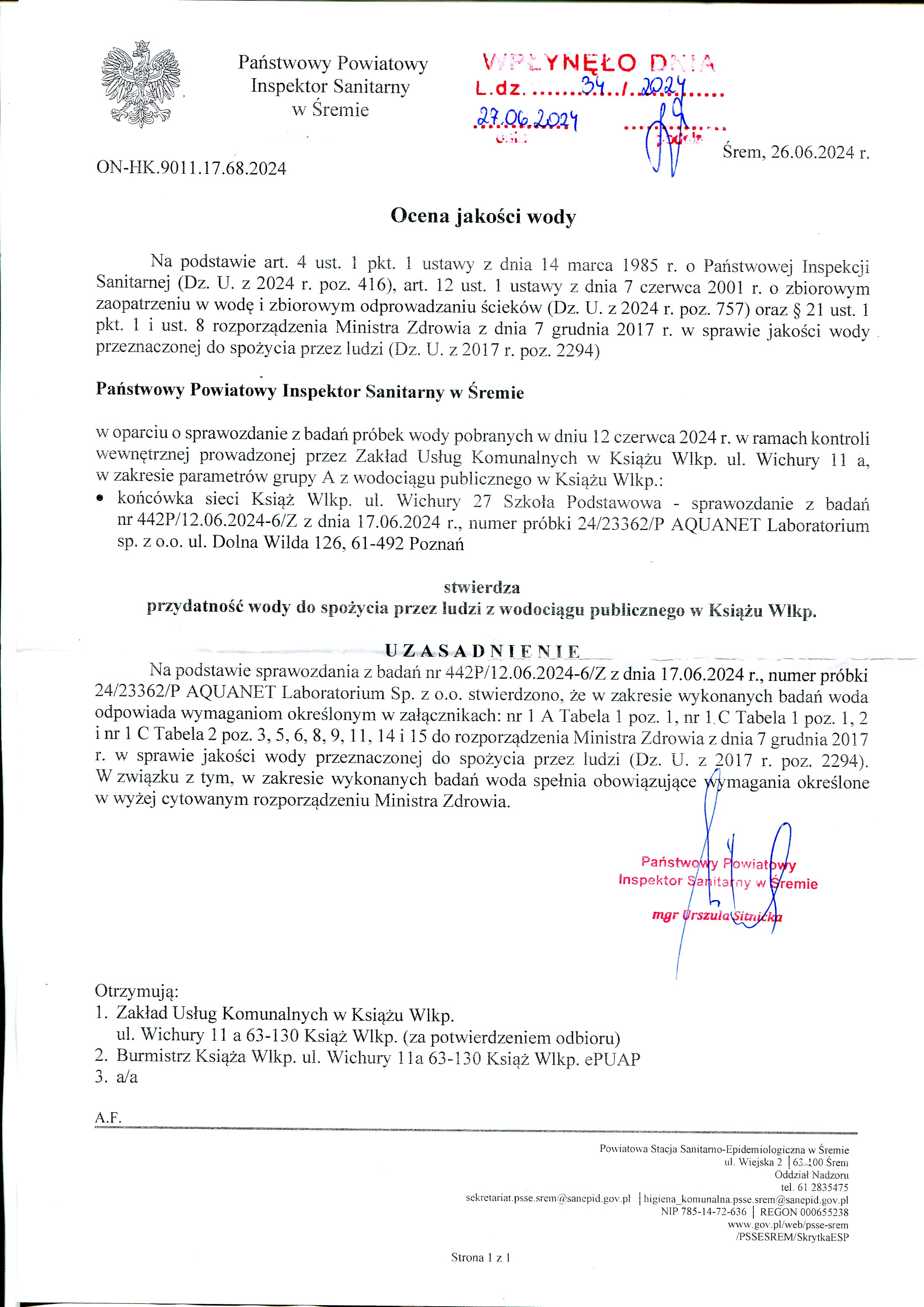 OCENA JAKOŚCI WODY CZERWIEC 2024