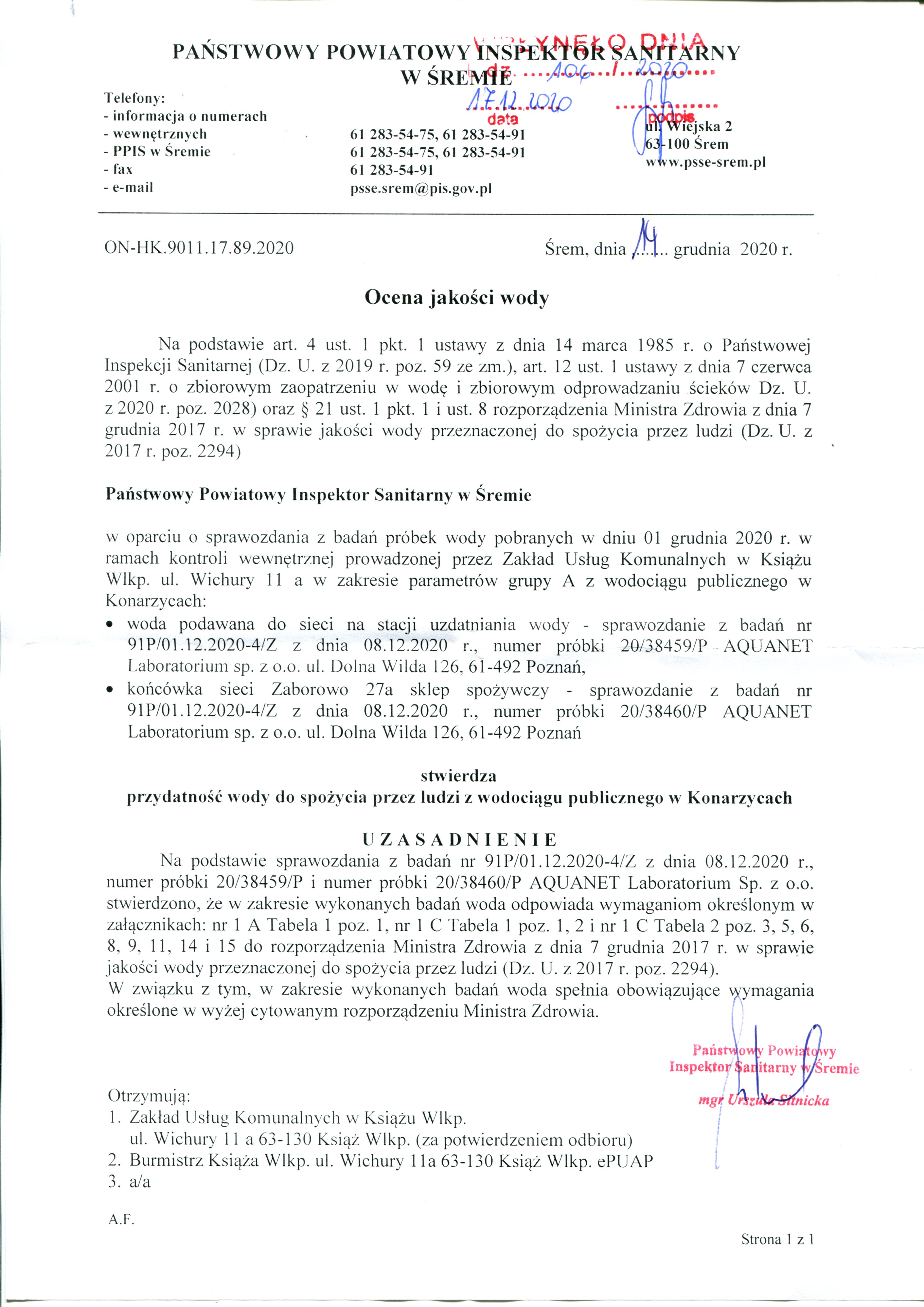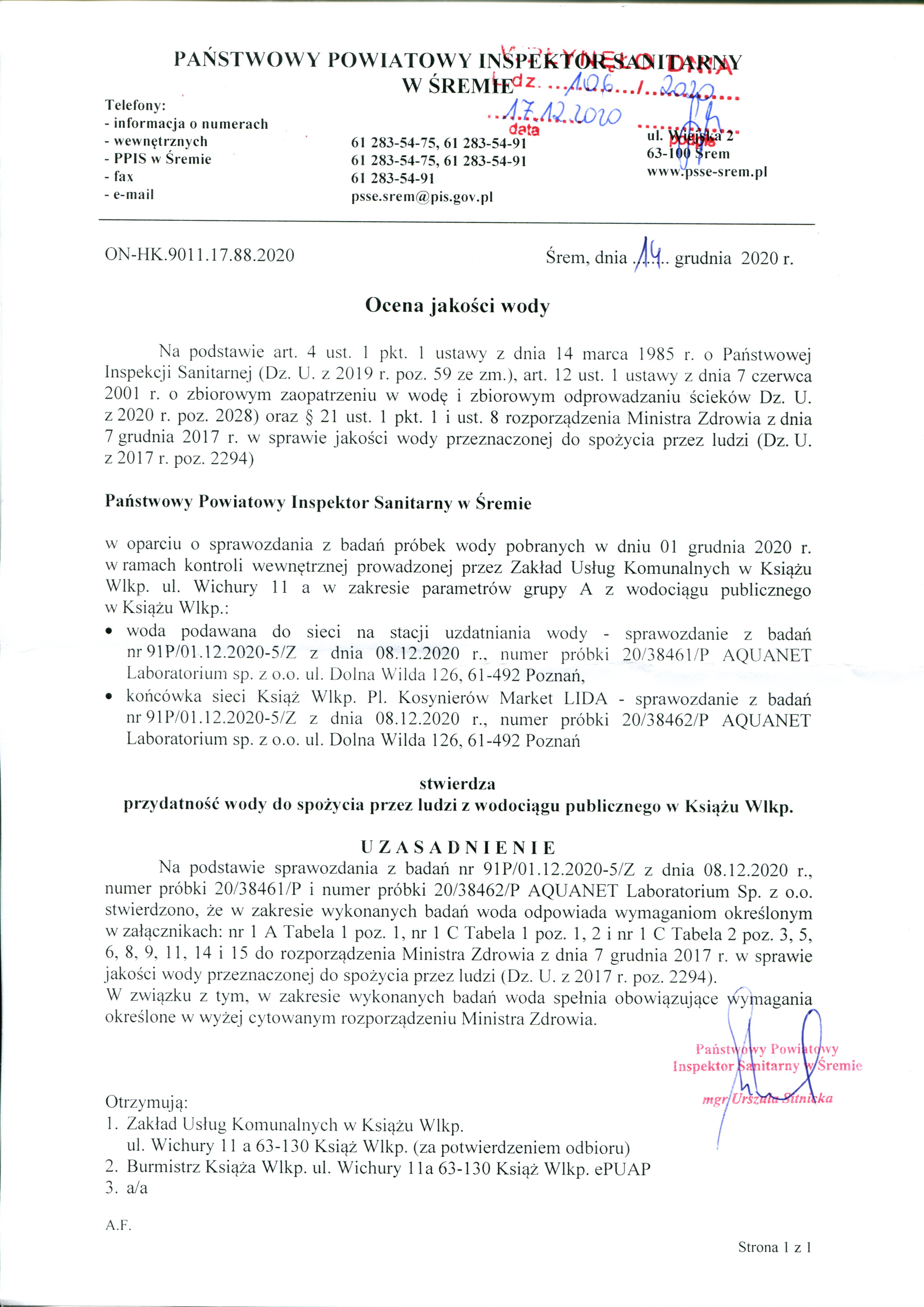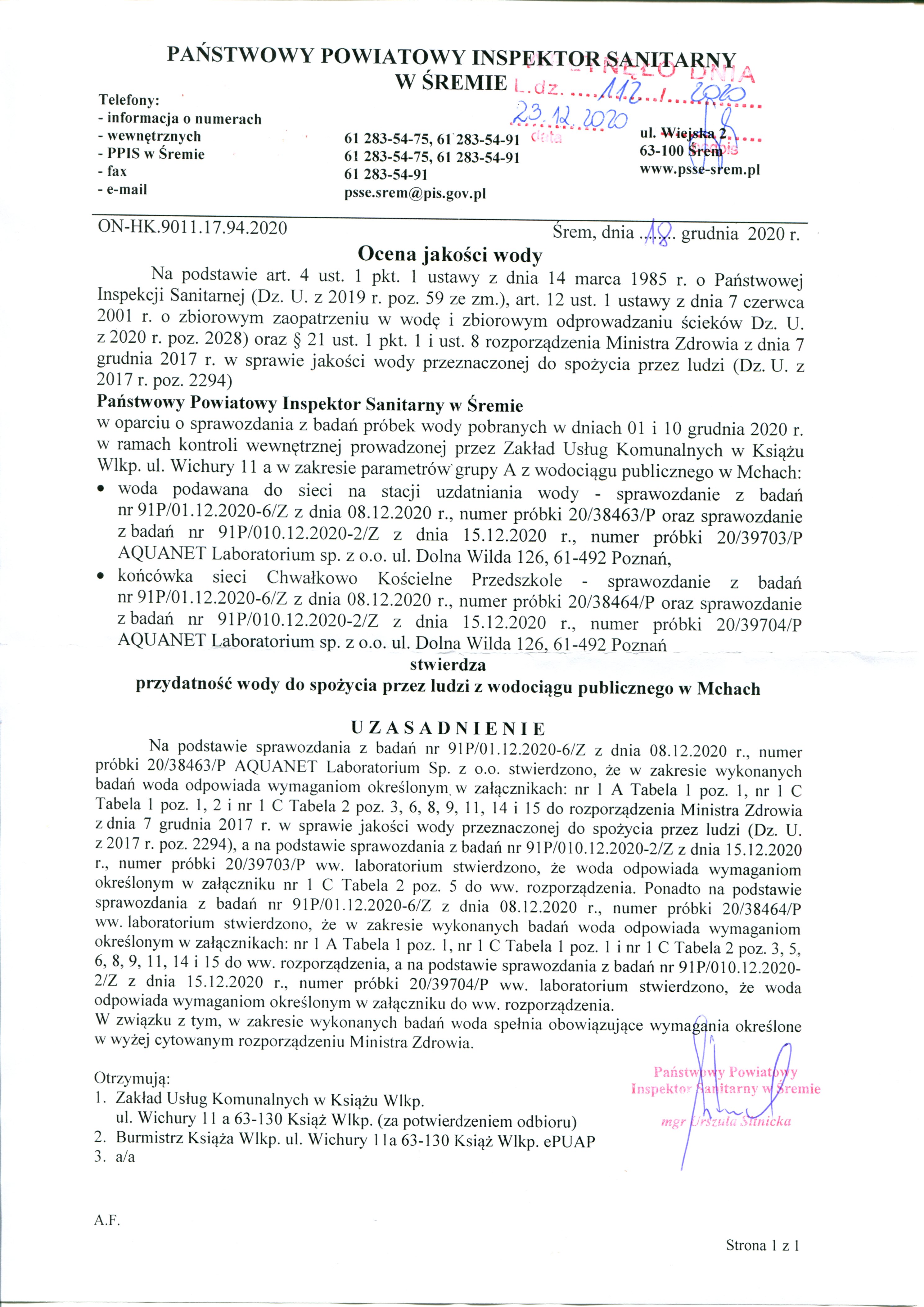 OCENA JAKOŚCI WODY GRUDZIEŃ 2020 R.