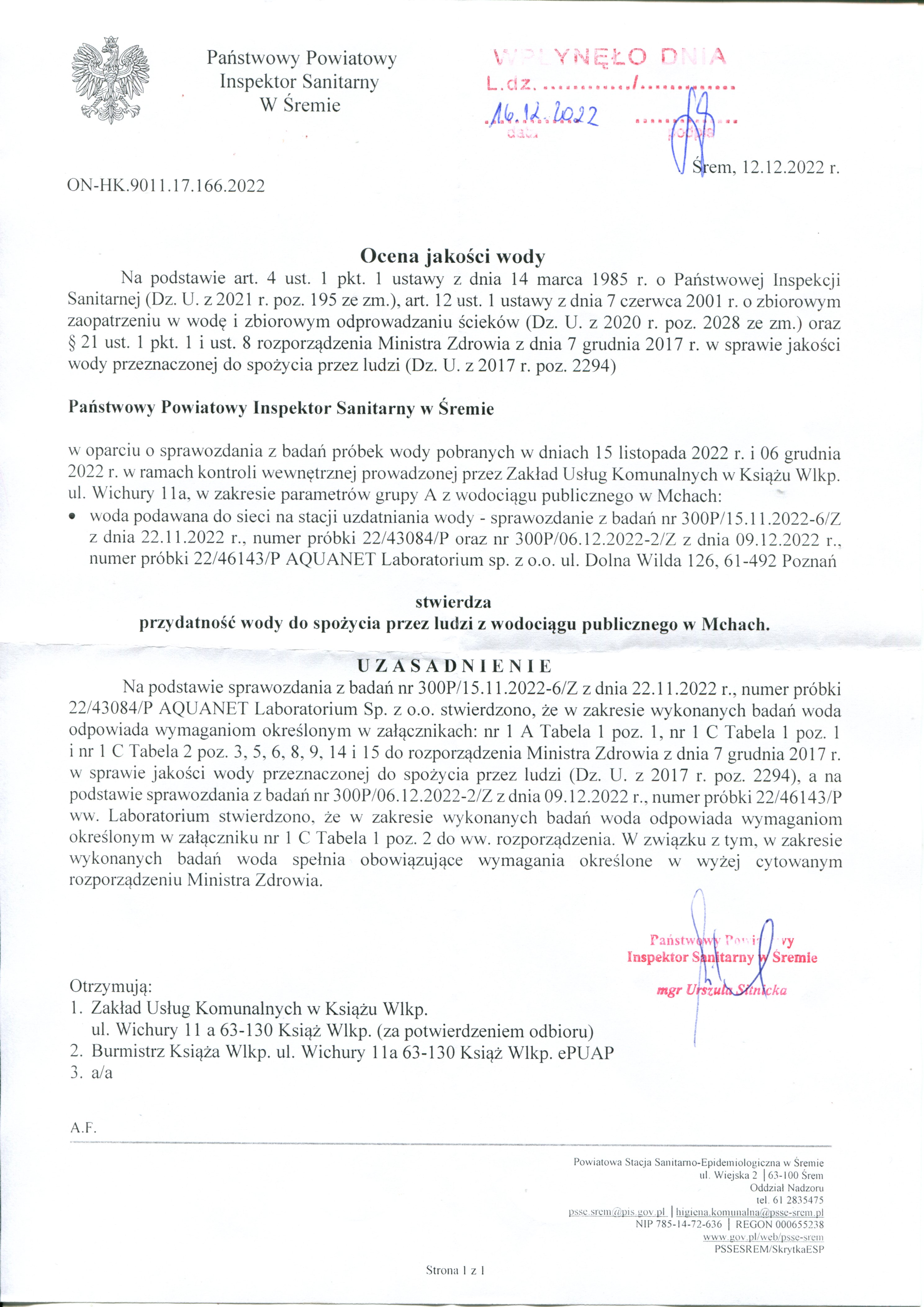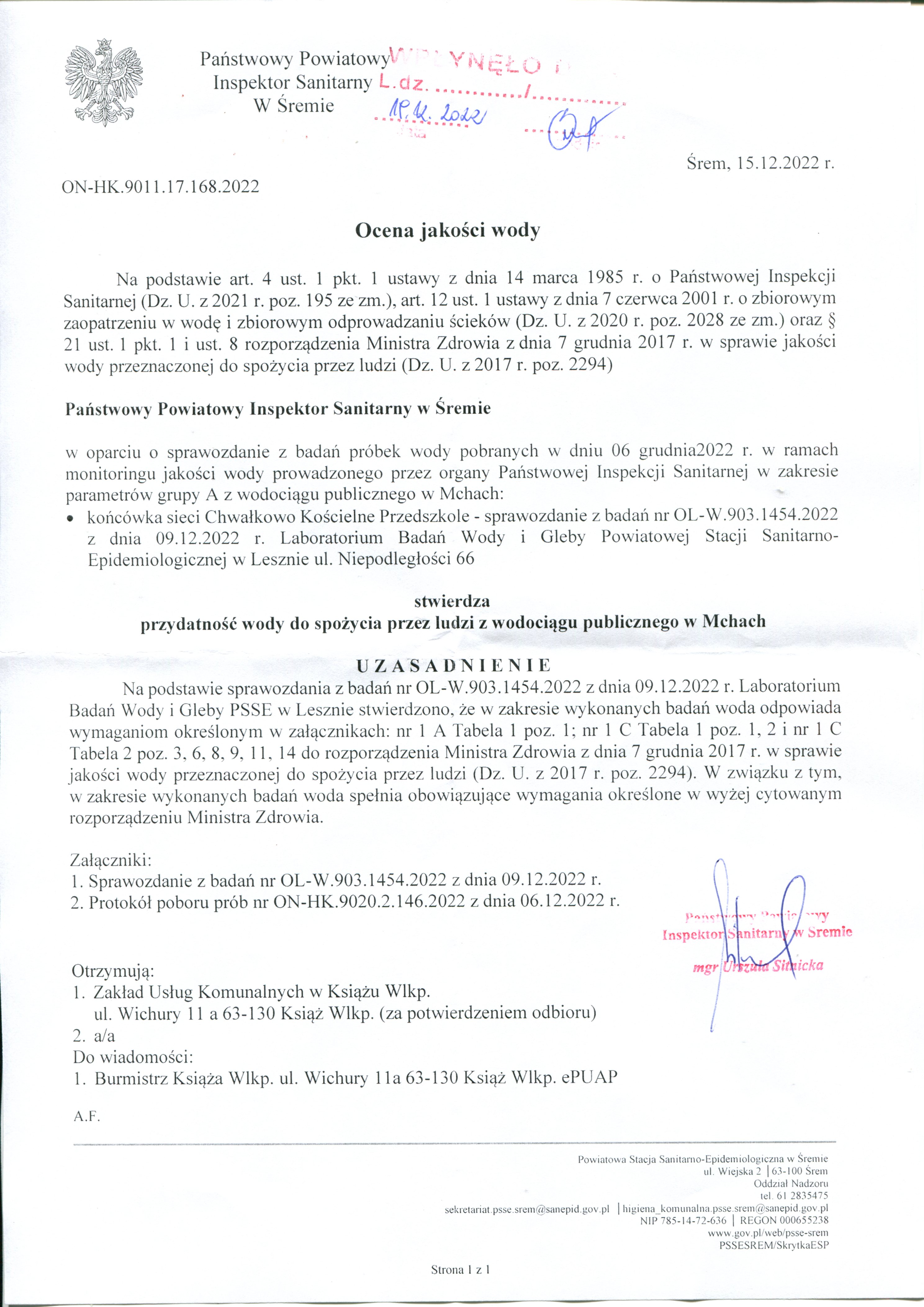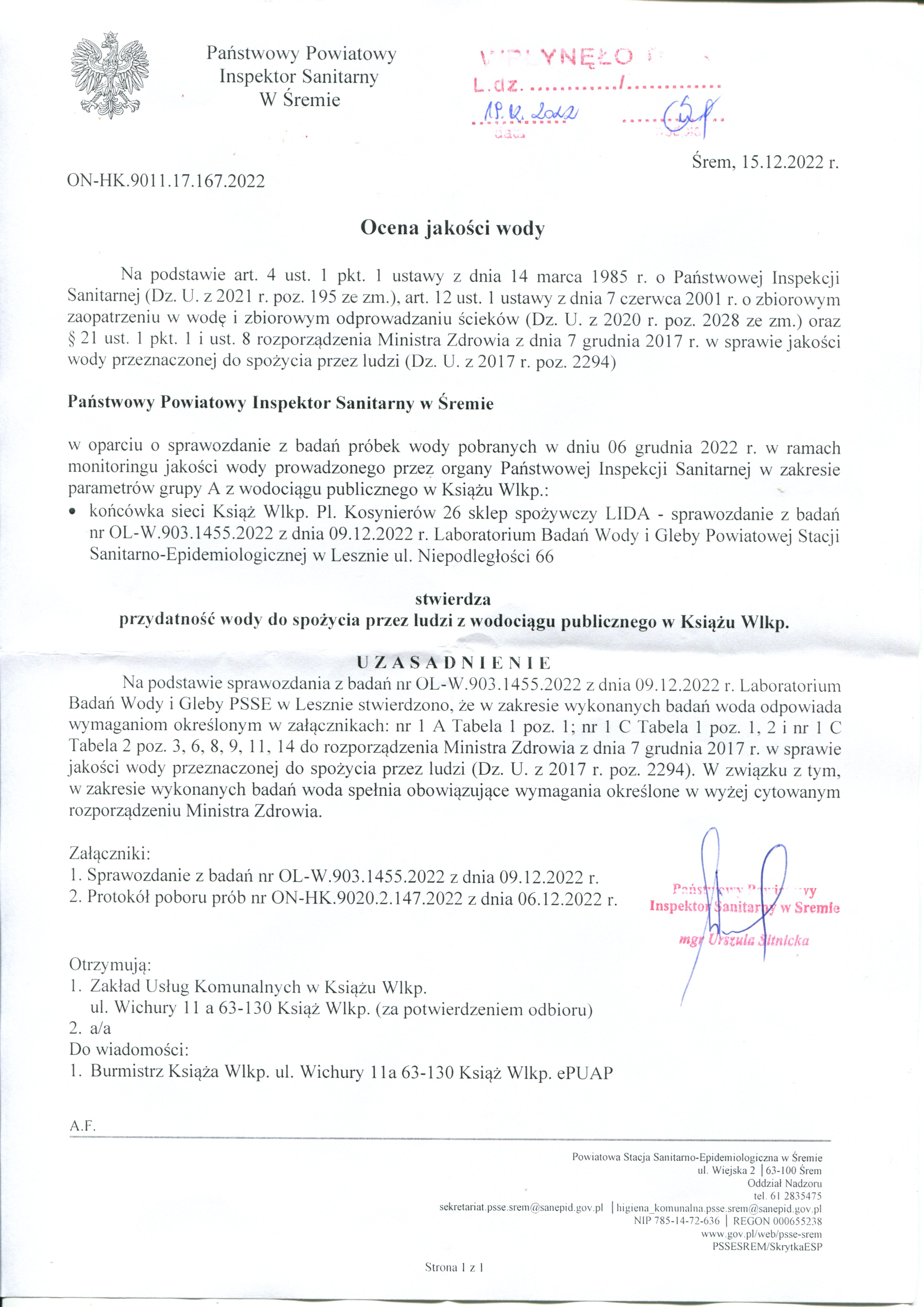 Ocena jakości wody – SUW Książ Wlkp. Ocena jakości wody – SUW Konarzyce Ocena jakości wody – SUW Mchy
