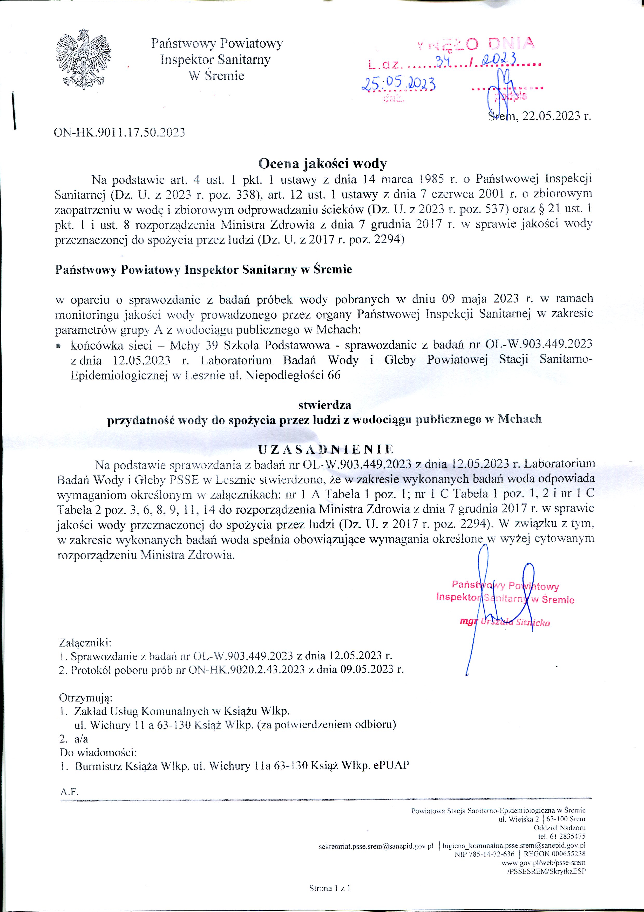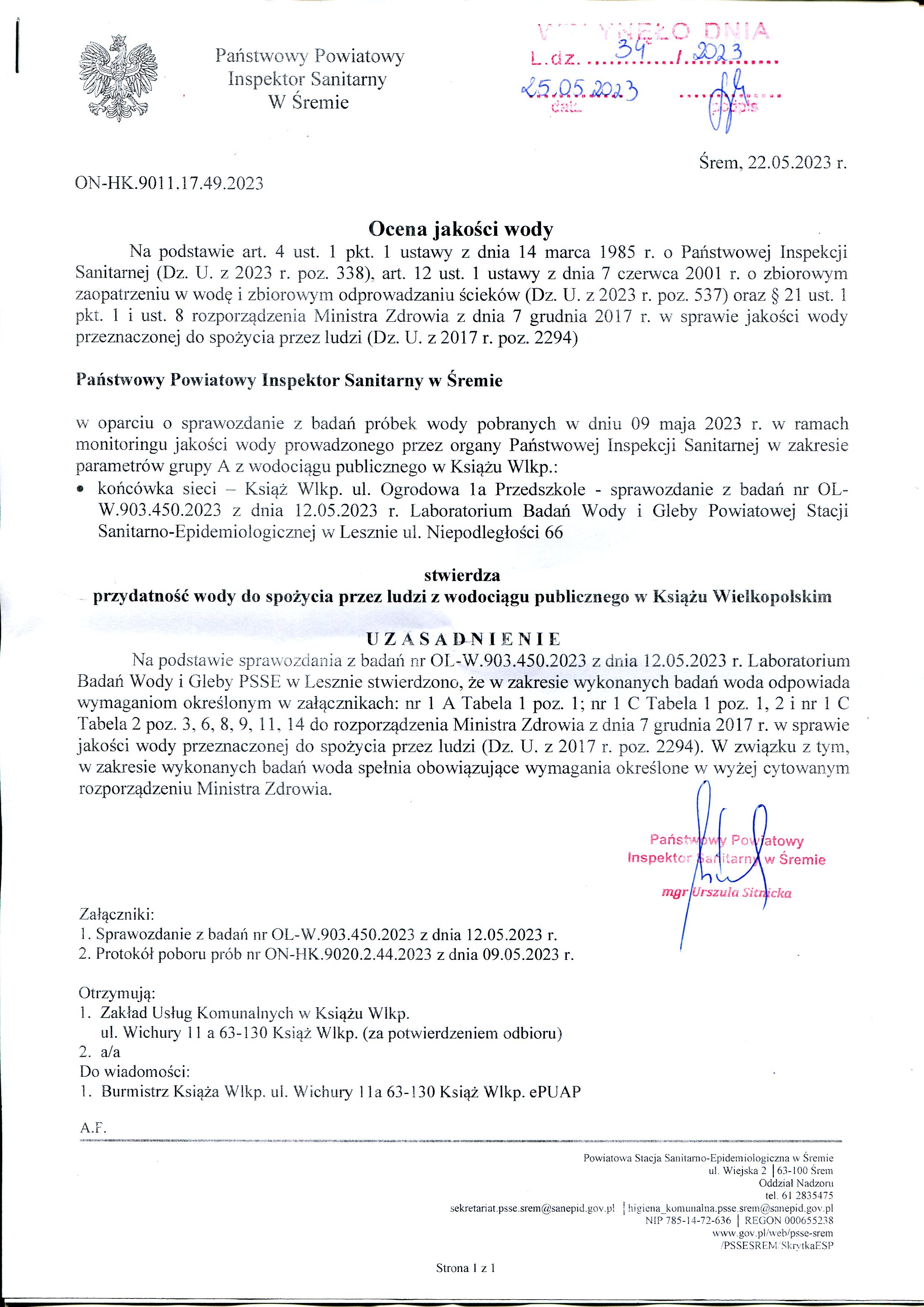 OCENA JAKOŚCI WODY MAJ 2023 R.